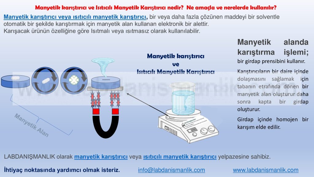 Sıvı numunelerin homojen olmasını sağlamak için laboratuvarlarda bir çok karıştırıcı ekipman kullanılır. Manyetik karıştırıcı veya ısıtıcılı manyetik karıştırıcı en yaygın olarak kullanılanlardandır.