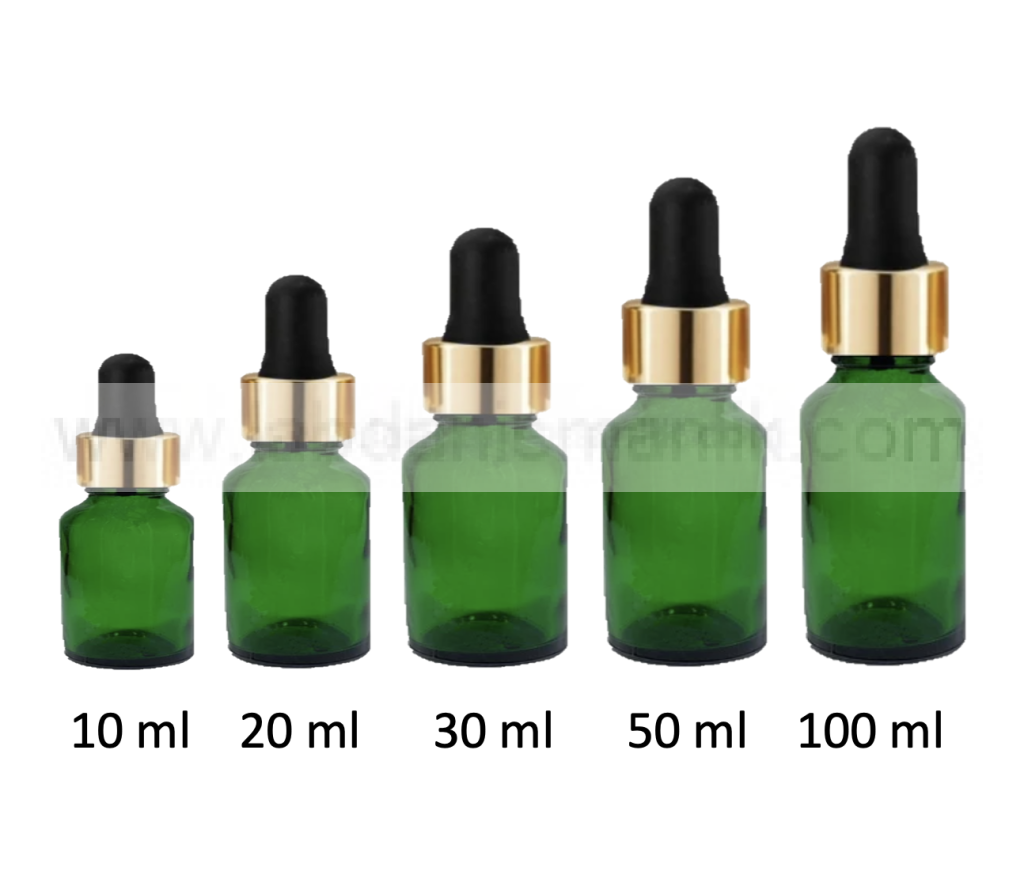10 – 20 – 30 – 50 – 100 ml Cam Şişe Damlalık, Yeşil cam damlalıklı şişe, Damlalıklı Yeşil Renk Cam Şişe Gold Başlıklı